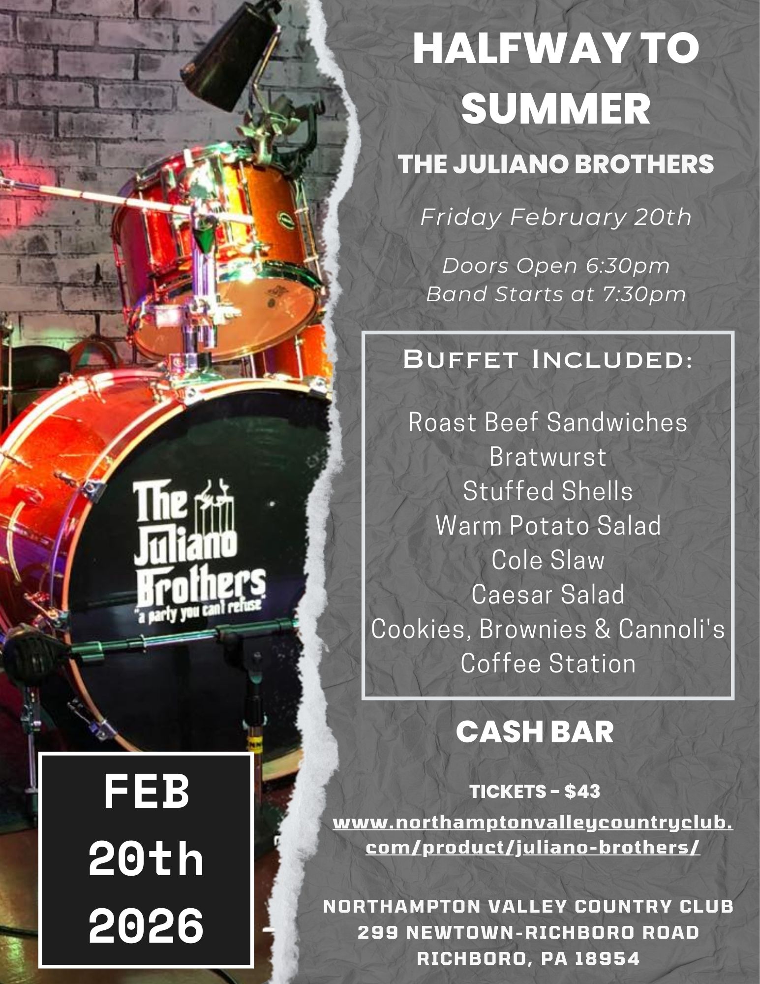 Doors Open at 6:30pm Band Starts at 7:30pm Buffet Included – Open Seating Cash Bar