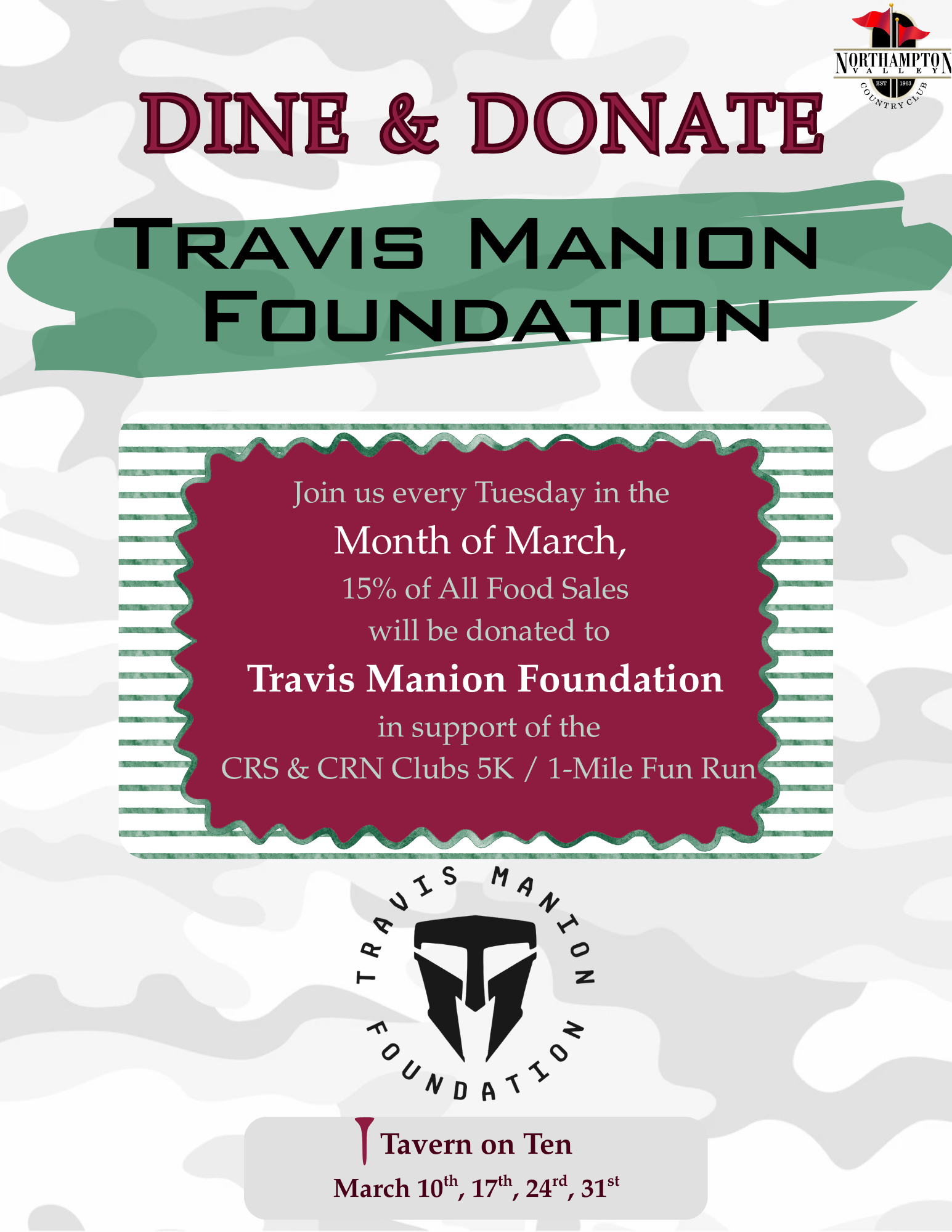 Every Tuesday throughout the month of March, 15% of our food sales will be donated to the Travis Manion Foundation in support of the CRS & CRN Clubs 5K / 1-Mile Fun Run.